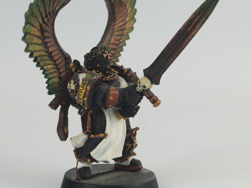 I used the same techniques as with my other Games Workshop figurines. First filing and sanding down the flash lines (residual material from the casting process), then I had to prepare the figure and the wings so I could attach them. As the figure and wings are pewter, this was a bit difficult and involved very strong glue, drilling a hole in the back of the figure and adding a small rod to the wings that fit into the hole. I painted all the parts before assembly and touched it up once assembled.